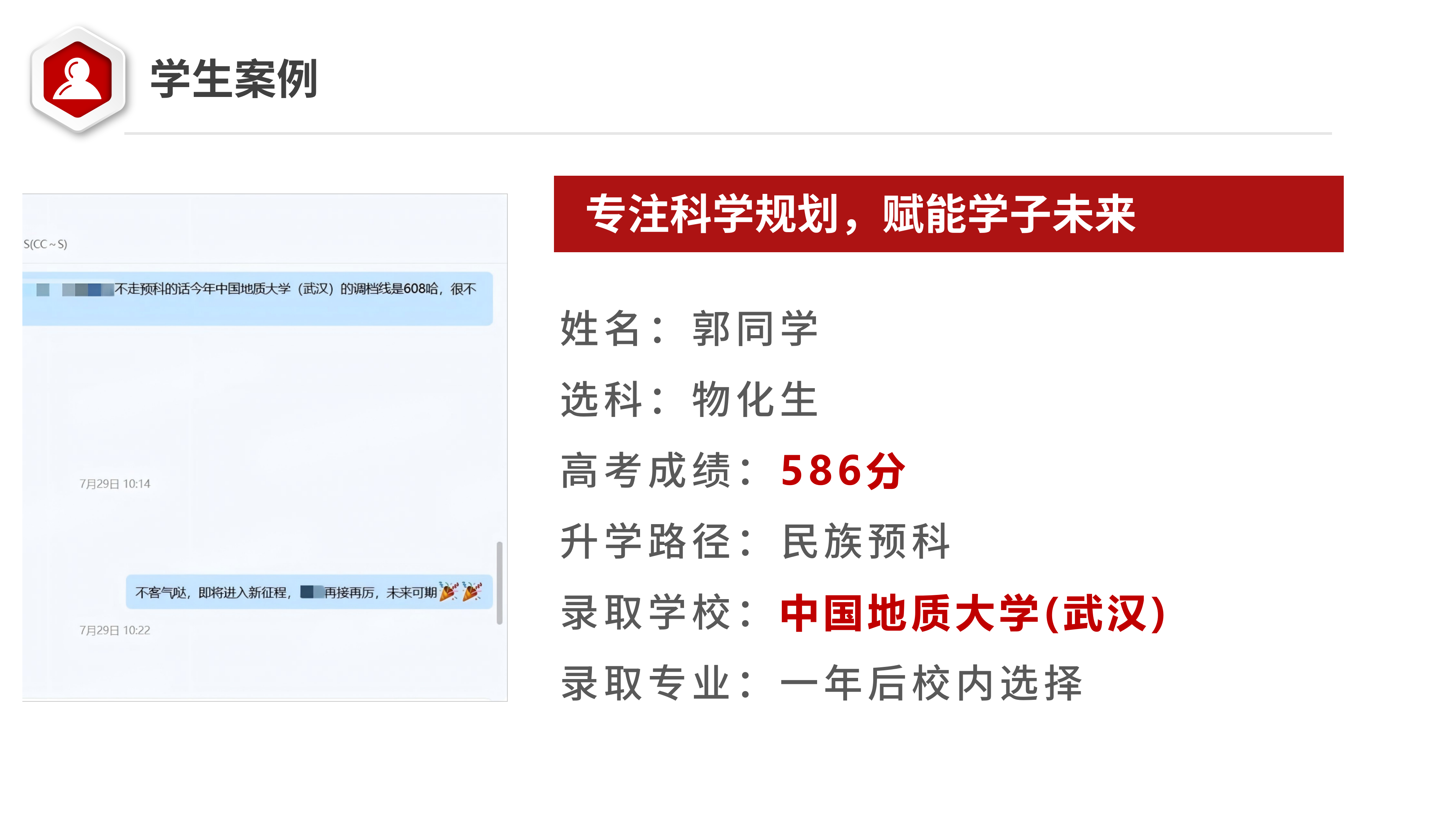 学生是少数民族,高考成绩586分,通过填报少数民族预科拿到了211院校——中国地质大学(武汉)的录取结果,该校常规专业组调档线为608分。