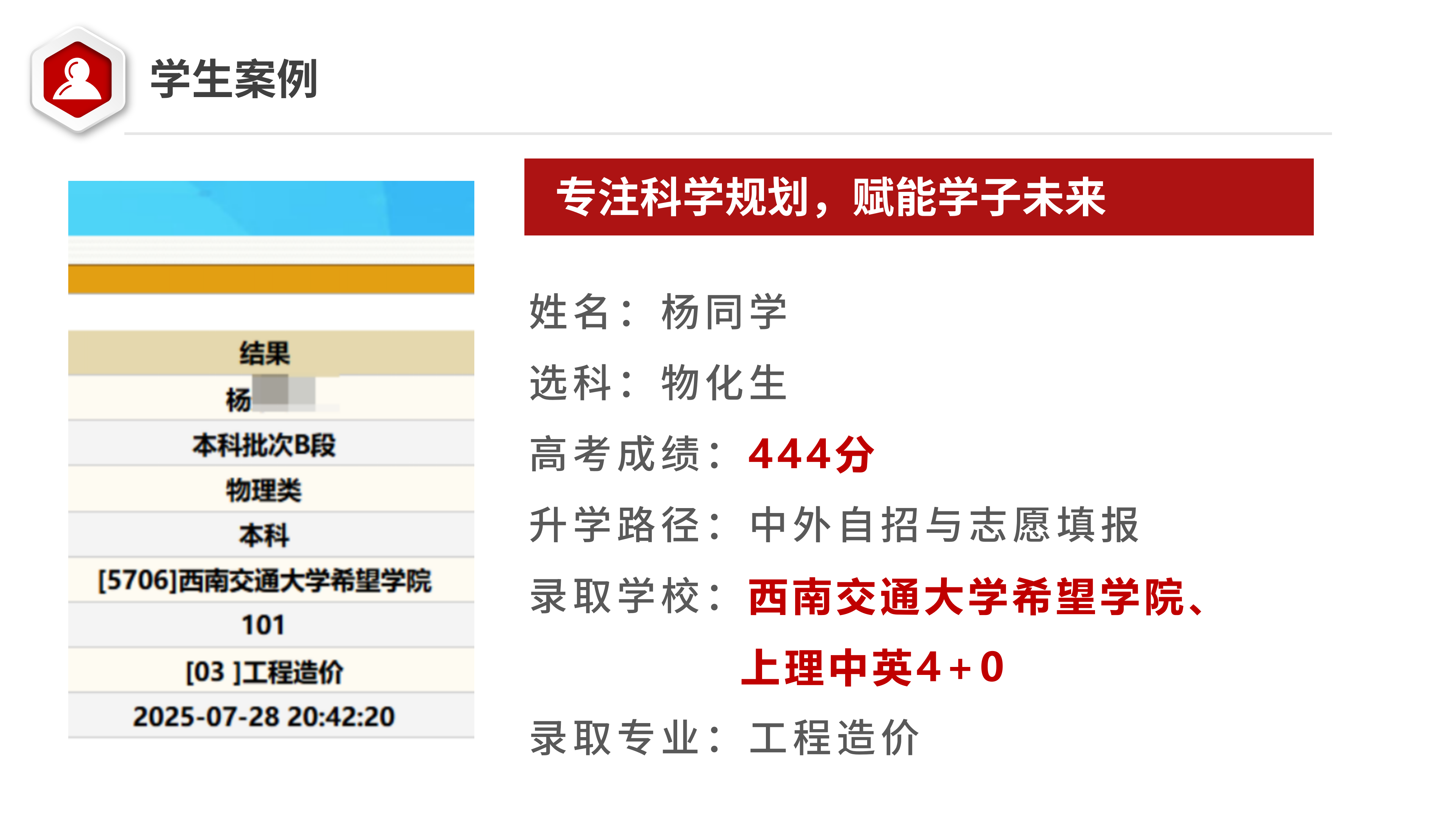 高考前没有一直没有上到本科线,高考分数上线6分。高考前帮助其拿到了上海理工大学中英4+0的预录取,信心倍增,更为努力冲刺高考,最终444分成功被本科录取。