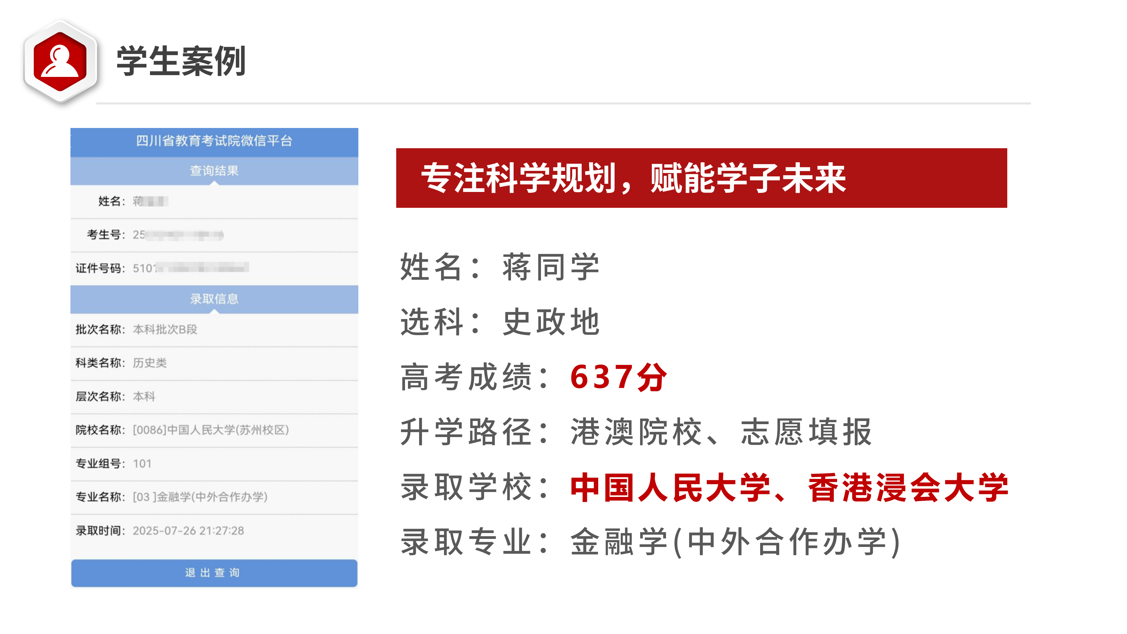 学生压力巨大,有时需依赖药物方能入睡。我们为其量身定制了以高考为核心、辅以香港院校申请的多元化升学方案。得知拥有优质香港院校作为保底选项后,学生心理负担显著减轻。最终高考637分上岸中国人民大学。