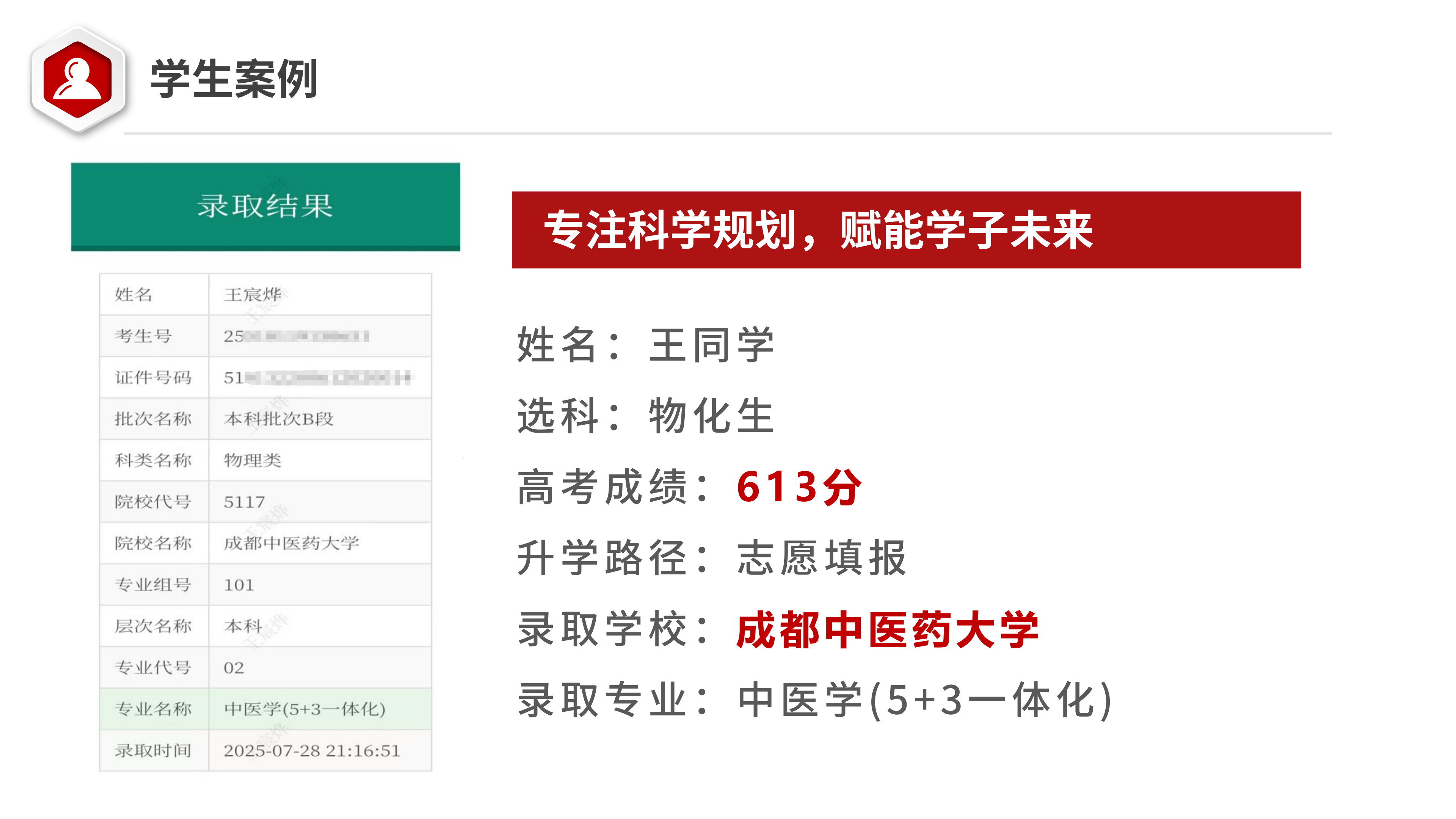 高考分数613分,虽然是物理类考生,但是学生排斥理工类专业,不想再学习物理和化学,最终和学生沟通后,选择了成都中医药大学中医学。